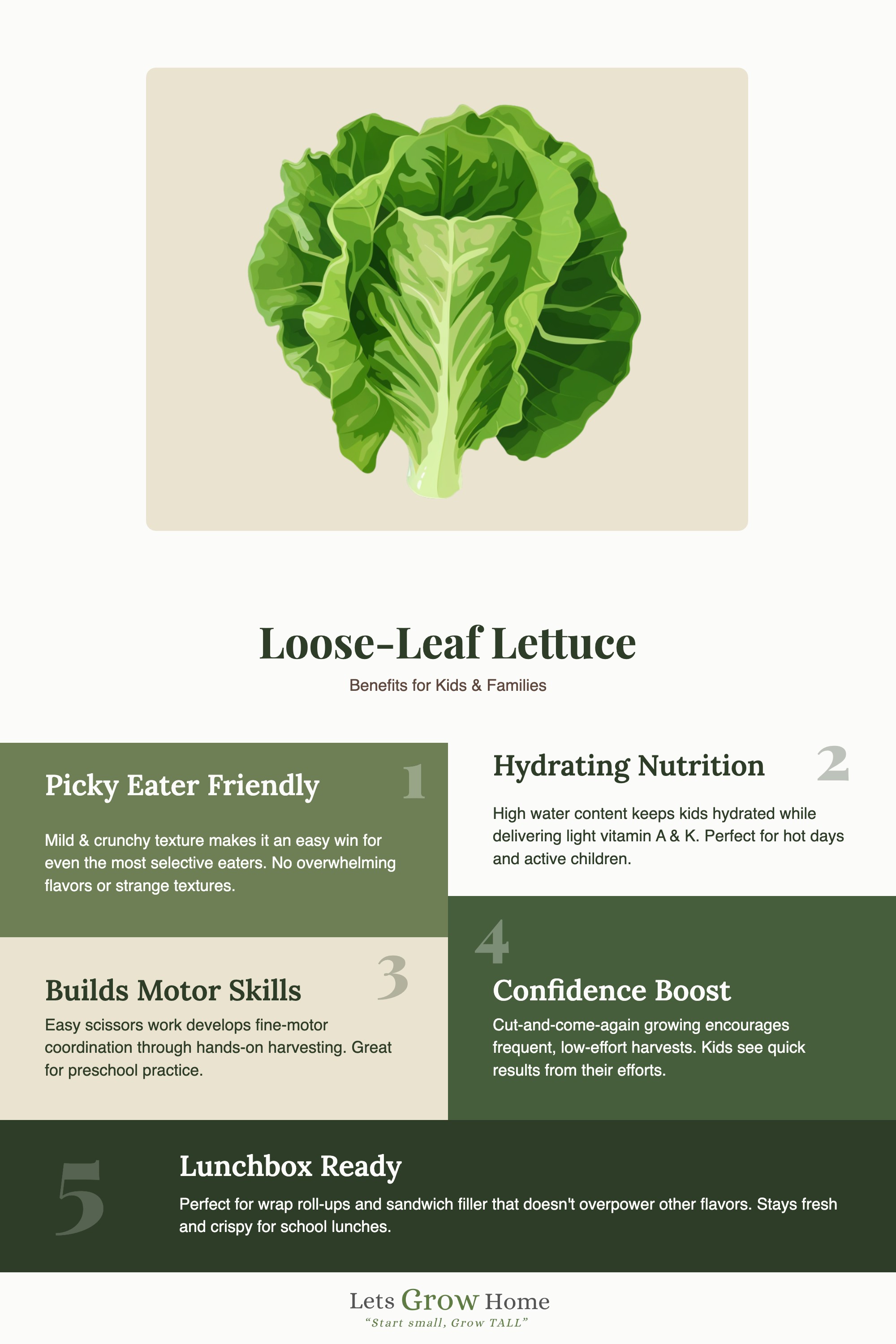 Why kids love them: Comes in fun colors—red, green, speckled—like a rainbow garden! The soft, ruffled leaves are easy for small hands to pick, and the mild, sweet taste doesn't overwhelm young palates. Kids can "harvest and it keeps growing" which feels like magic.