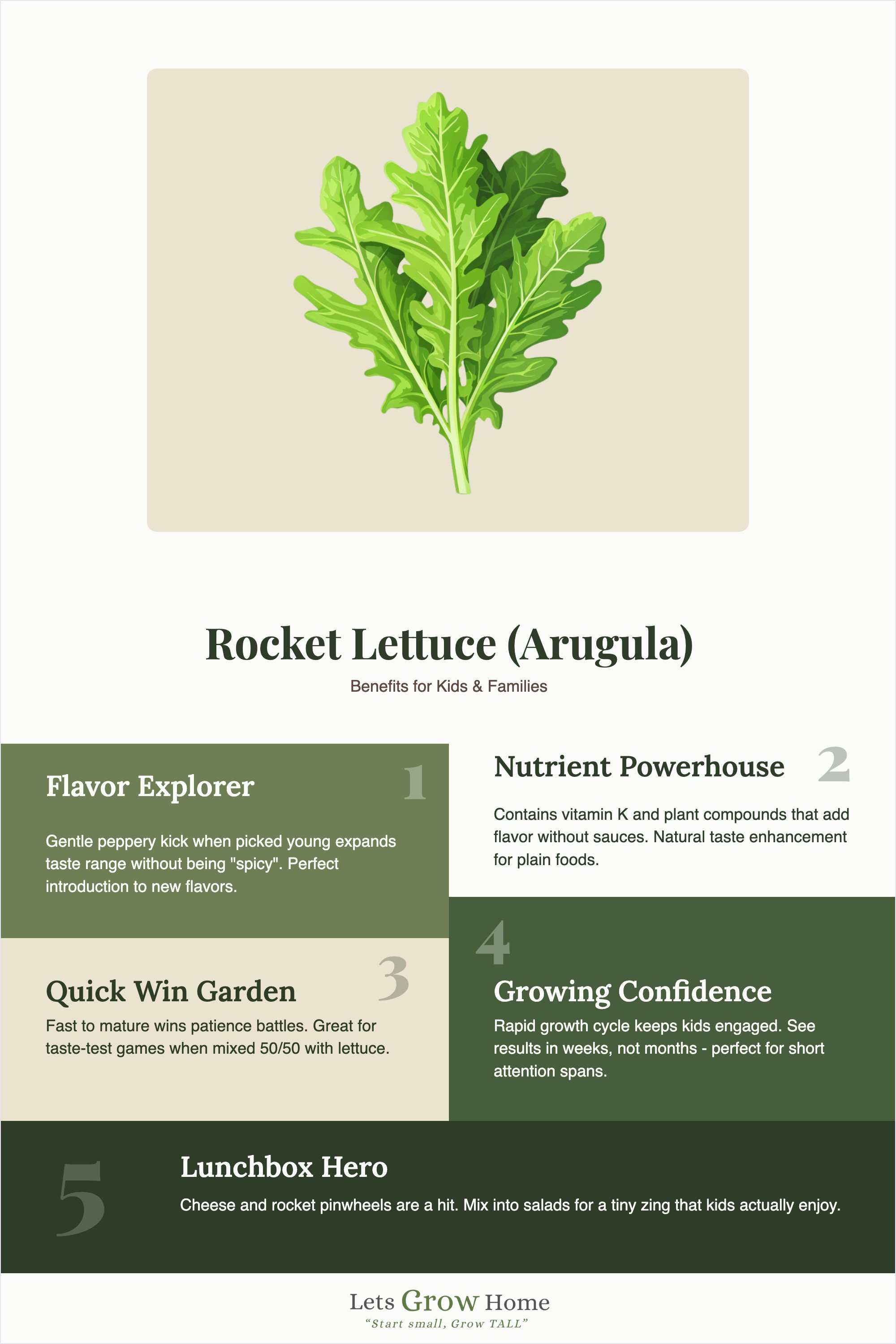 Kid-friendly serving: Mix baby rocket with sweet fruits like strawberries or pears to balance flavors, or hide in pesto for pasta.