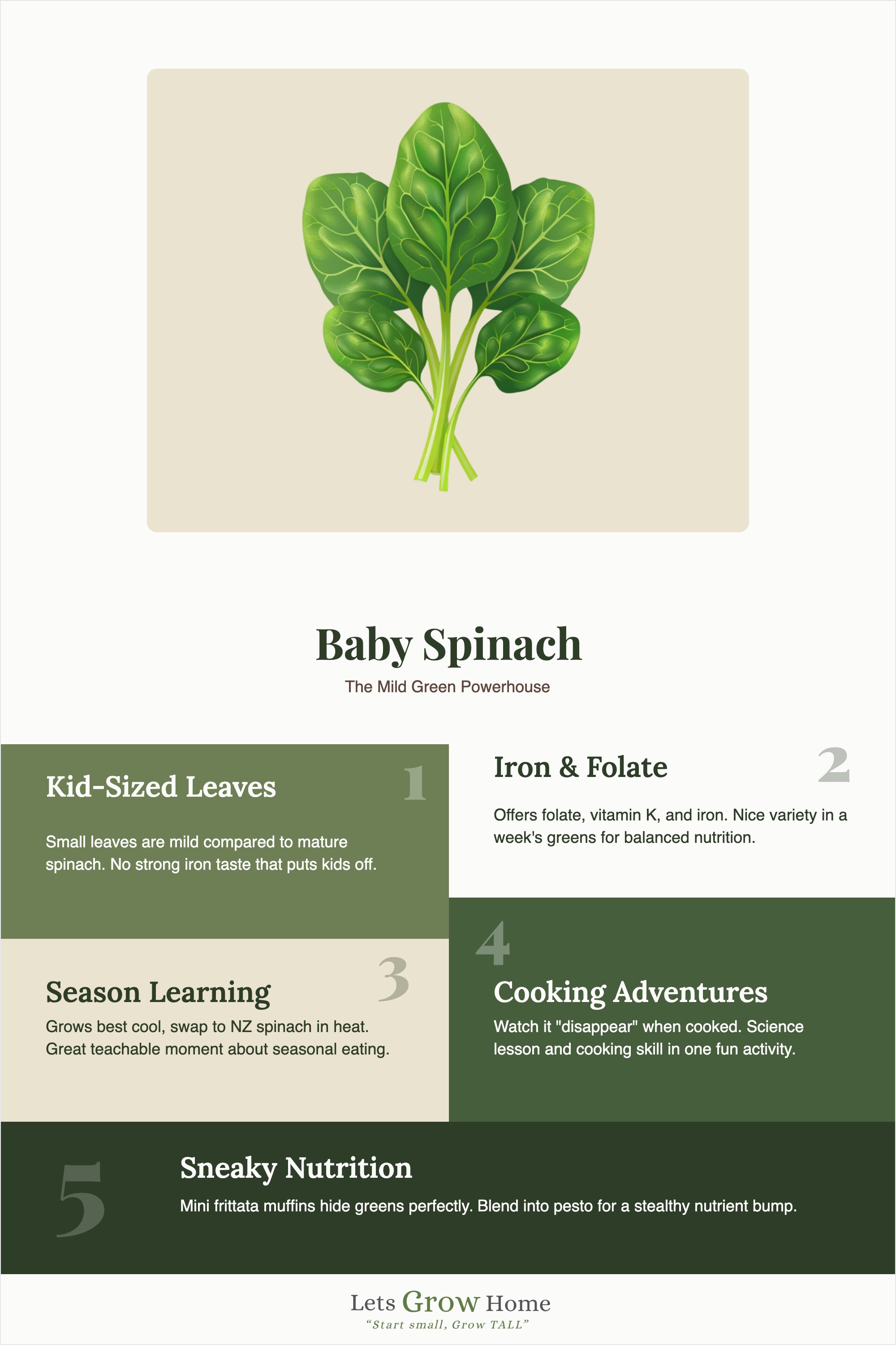Why kids love them: Baby spinach is tender and mild—nothing like the strong, sometimes bitter mature spinach. NZ spinach has succulent, almost lemony leaves that stay crisp in summer heat. Both are "Popeye's power food" which makes eating them an adventure.